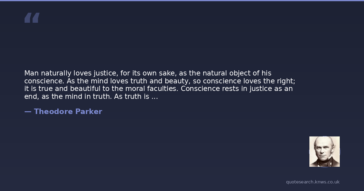 Man naturally loves justice, for its own sake, as the natural object of his conscience. As the mind loves truth and beauty, so conscience loves the right; it is true and beautiful to the moral faculties. Conscience rests in justice as an end, as the mind in truth. As truth is the side of God turned towards the intellect, so is justice the side of Him which conscience looks upon. Love of justice is the moral part of piety.