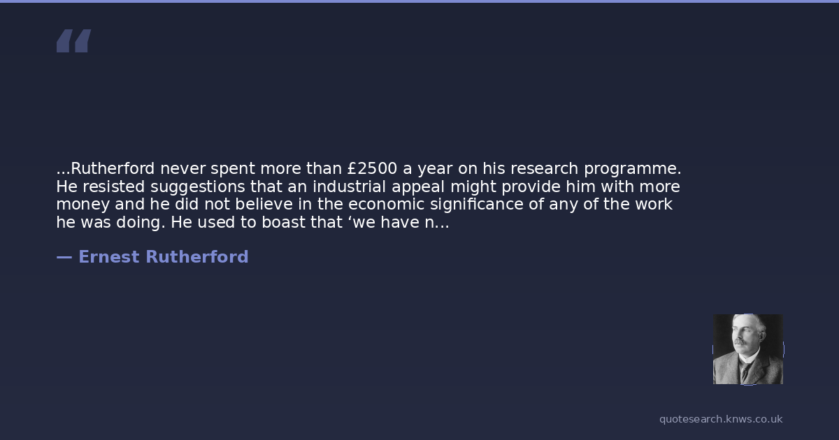 ...Rutherford never spent more than £2500 a year on his research programme. He resisted suggestions that an industrial appeal might provide him with more money and he did not believe in the economic significance of any of the work he was doing. He used to boast that ‘we have no money, so we shall have to think’.