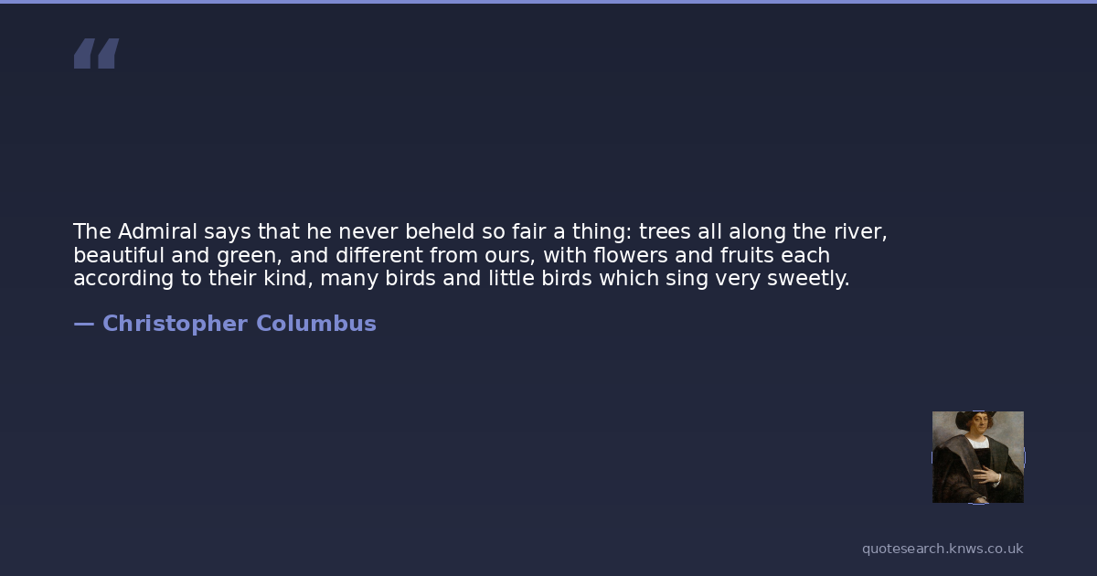 The Admiral says that he never beheld so fair a thing: trees all along the river, beautiful and green, and different from ours, with flowers and fruits each according to their kind, many birds and little birds which sing very sweetly.