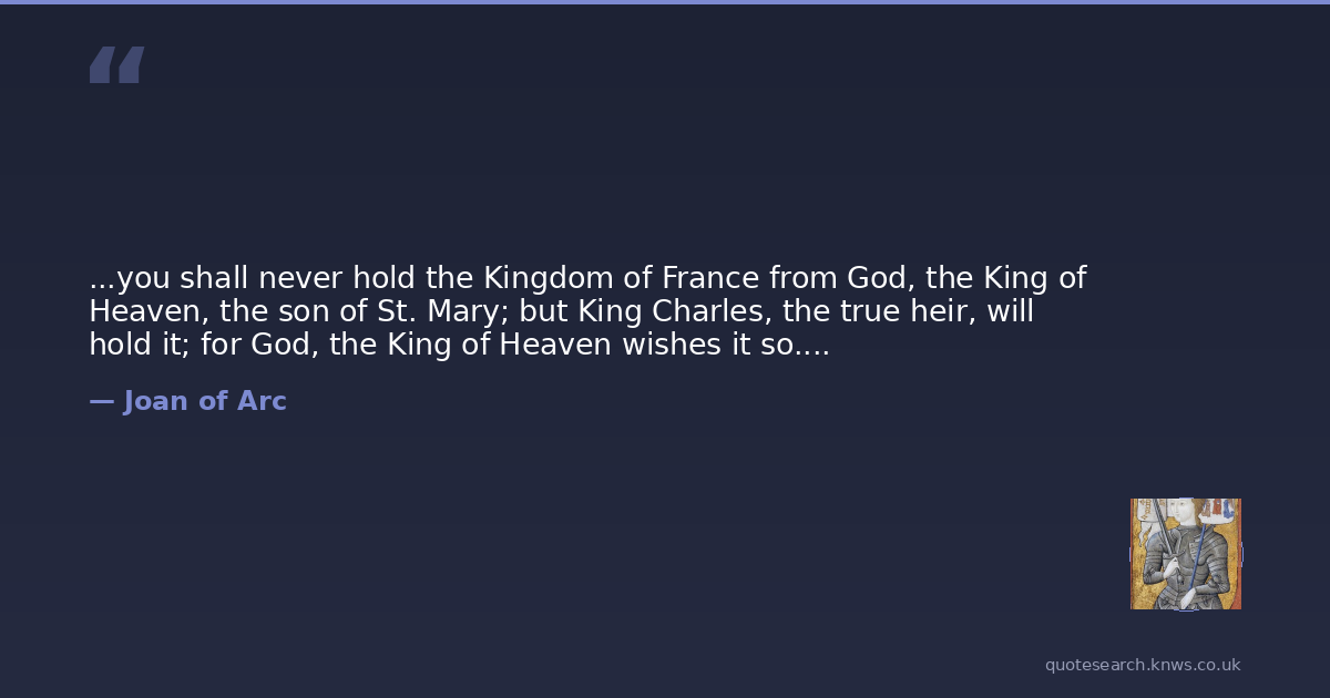 ...you shall never hold the Kingdom of France from God, the King of Heaven, the son of St. Mary; but King Charles, the true heir, will hold it; for God, the King of Heaven wishes it so....