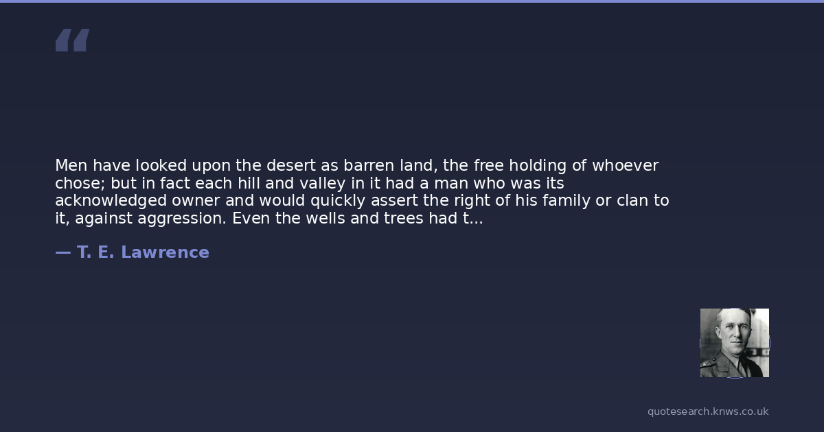 Men have looked upon the desert as barren land, the free holding of whoever chose; but in fact each hill and valley in it had a man who was its acknowledged owner and would quickly assert the right of his family or clan to it, against aggression. Even the wells and trees had their masters, who allowed men to make firewood of the one and drink of the other freely, as much as was required for their need, but who would instantly check anyone trying to turn the property to account and to exploit it or its products among others for private benefit. The desert was held in a crazed communism by which Nature and the elements were for the free use of every known friendly person for his own purposes and no more. Logical outcomes were the reduction of this licence to privilege by the men of the desert, and their hardness to strangers unprovided with introduction or guarantee, since the common security lay in the common responsibility of kinsmen.