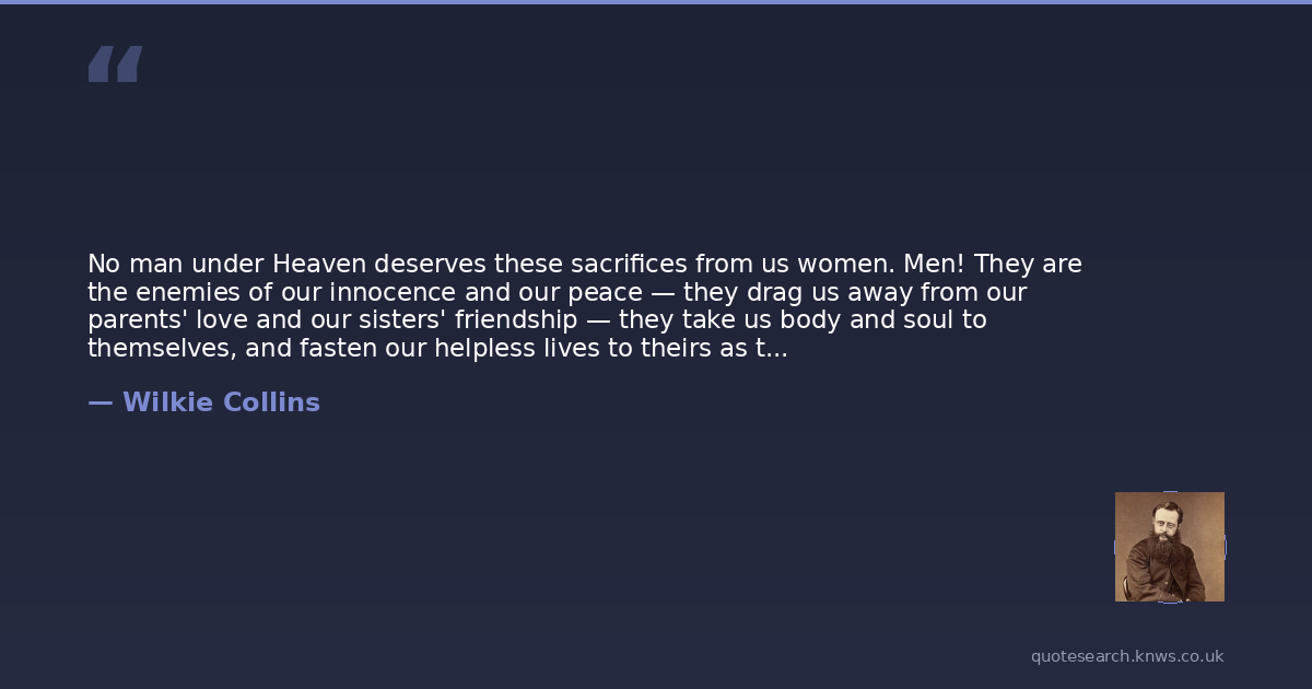 No man under Heaven deserves these sacrifices from us women. Men! They are the enemies of our innocence and our peace — they drag us away from our parents' love and our sisters' friendship — they take us body and soul to themselves, and fasten our helpless lives to theirs as they chain up a dog to his kennel.