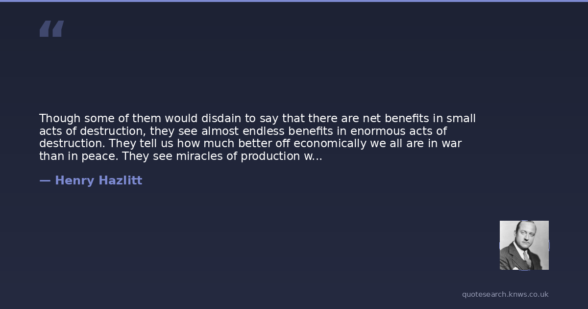 Though some of them would disdain to say that there are net benefits in small acts of destruction, they see almost endless benefits in enormous acts of destruction. They tell us how much better off economically we all are in war than in peace. They see miracles of production which it requires a war to achieve. And they see a postwar world made certainly prosperous by an enormous accumulated or backed up demand. In Europe they joyously count the houses, the whole cities that have been leveled to the ground and that will have to be replaced. In America they count the houses that could not be built during the war, the nylon stockings that could not be supplied, the worn-out automobiles and tires, the obsolescent radios and refrigerators. They bring together formidable totals.It is merely our old friend, the broken-window fallacy, in new clothing, and grown fat beyond recognition. This time it is supported by a whole bundle of related fallacies. It confuses need with demand.