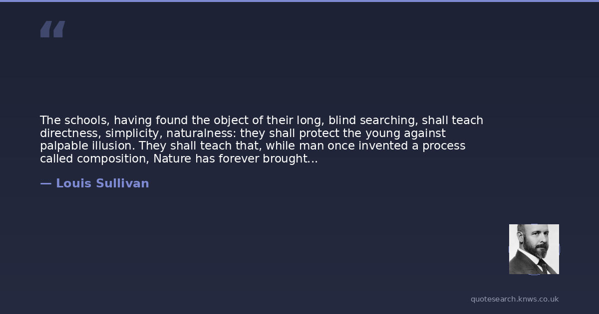 The schools, having found the object of their long, blind searching, shall teach directness, simplicity, naturalness: they shall protect the young against palpable illusion. They shall teach that, while man once invented a process called composition, Nature has forever brought forth organisms. They shall encourage the love of Nature that wells up in every childish heart, and shall not suppress, shall not stifle, the teeming imagination of the young. They shall teach, as the result of their own bitter experience, that conscious mental effort, that conscious emotionality, are poor mates to breed from, and that true parturition comes of a deep, instinctive, subconscious desire. That true art, springing fresh from Nature, must have in it, to live, much of the glance of an eye, much of the sound of a voice, much of the life of a life. That Nature is strong, generous, comprehensive, fecund, subtile: that in growth and decadence she continually sets forth the drama of man's life. That, thro' the rotating seasons, thro' the procession of the years, thro' the march of the centuries, permeating all, sustaining all, there murmurs the still, small voice of a power that holds us in the hollow of its hand.