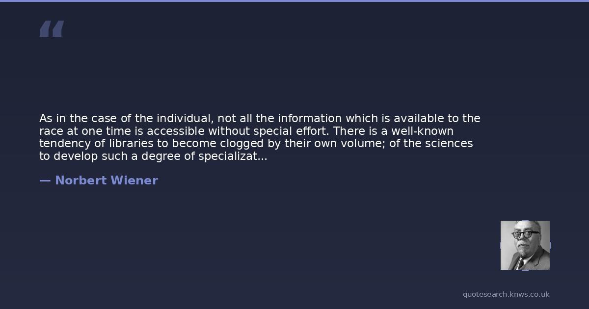 As in the case of the individual, not all the information which is available to the race at one time is accessible without special effort. There is a well-known tendency of libraries to become clogged by their own volume; of the sciences to develop such a degree of specialization that the expert is often illiterate outside his own minute specialty. Dr. Vannevar Bush has suggested the use of mechanical aids for the searching through vast bodies of material. These probably have their uses, but they are limited by the impossibility of classifying a book under an unfamiliar heading unless some particular person has already recognized the relevance of that heading for that particular book. In the case where two subjects have the same technique and intellectual content but belong to widely separated fields, this still requires some individual with an almost Leibnizian catholicity of interest.
