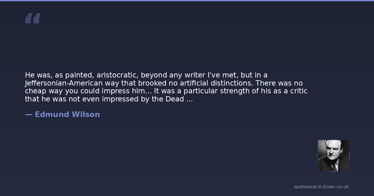 He was, as painted, aristocratic, beyond any writer I've met, but in a Jeffersonian-American way that brooked no artificial distinctions. There was no cheap way you could impress him... It was a particular strength of his as a critic that he was not even impressed by the Dead as such. He could write of living authors in precisely the same tones, and applying the same standards, as he used for the Classics.