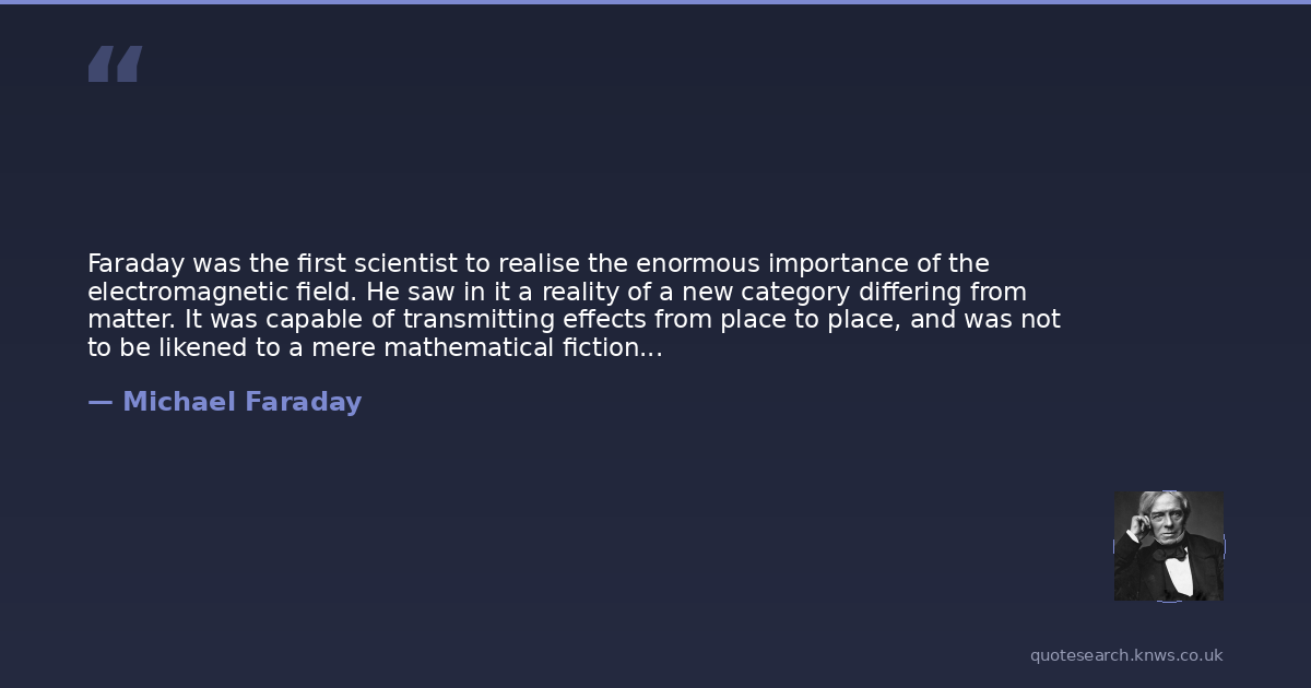 Faraday was the first scientist to realise the enormous importance of the electromagnetic field. He saw in it a reality of a new category differing from matter. It was capable of transmitting effects from place to place, and was not to be likened to a mere mathematical fiction such as the gravitational field was then assumed to be. In his opinion, the phenomena of electricity and magnetism should be approached via the field rather than via the charged bodies and currents. In other words, according to Faraday, when a current was flowing along a wire, the most important aspect of the phenomenon lay not in the current itself but in the fields of electric and magnetic force distributed throughout space in the current's vicinity. It is this elevation of the field to a position of preeminence that is often called the pure physics of the field. Faraday was not a mathematician and was unable to co-ordinate the phenomena he foresaw in a mathematical way, and derive the full benefit from his ideas. Before dying, however, he entrusted this task to his colleague Maxwell; and one of the most astonishing theories of science, eclipsed only in recent years by Einstein's theory of relativity, was the outcome.