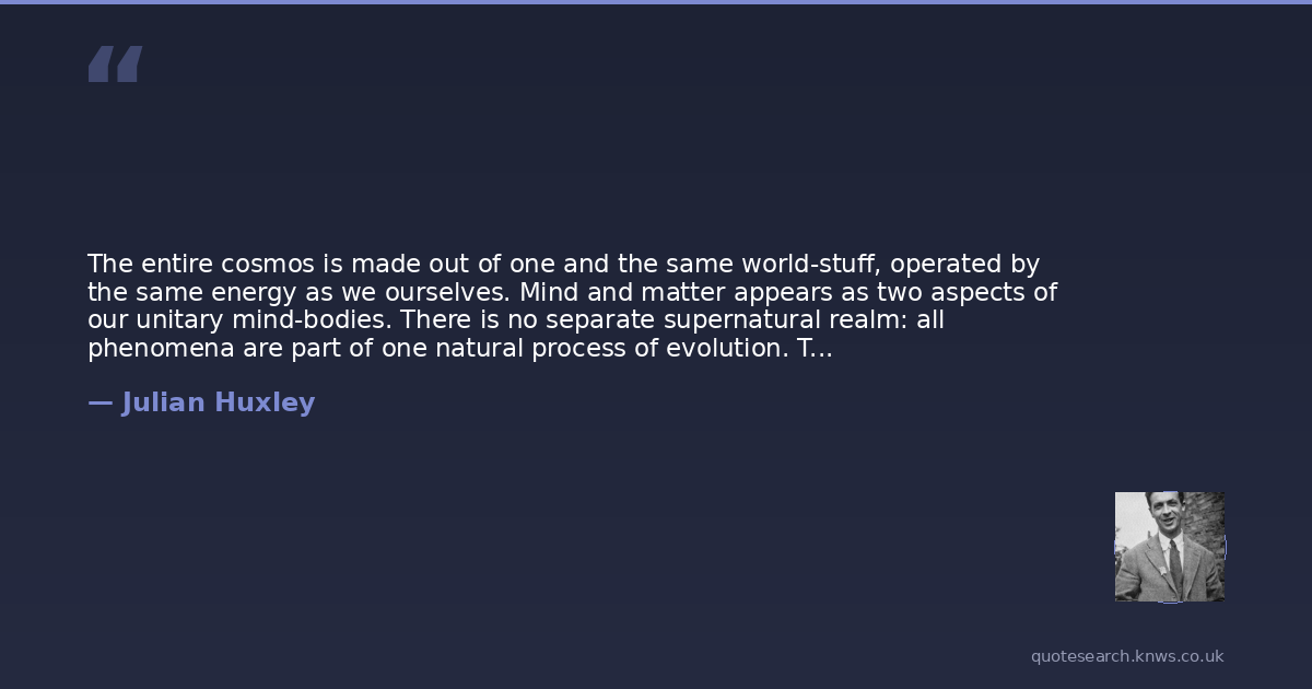 The entire cosmos is made out of one and the same world-stuff, operated by the same energy as we ourselves. Mind and matter appears as two aspects of our unitary mind-bodies. There is no separate supernatural realm: all phenomena are part of one natural process of evolution. There is no basic cleavage between science and religion; they are both organs of evolving humanity.