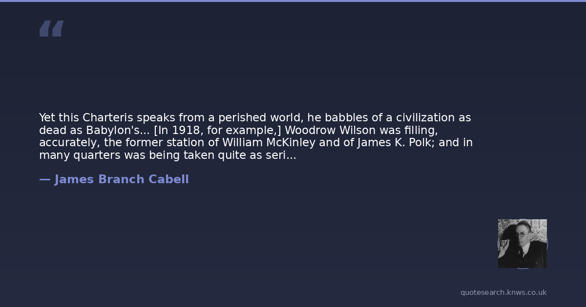 Yet this Charteris speaks from a perished world, he babbles of a civilization as dead as Babylon's... [In 1918, for example,] Woodrow Wilson was filling, accurately, the former station of William McKinley and of James K. Polk; and in many quarters was being taken quite as seriously as had been his predecessors during their own personally directed wars for moral principles so consistently elevated that they have never yet sunk into human comprehension.