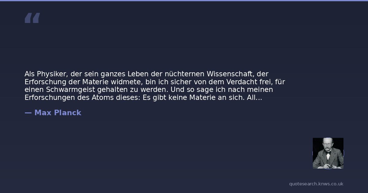 Als Physiker, der sein ganzes Leben der nüchternen Wissenschaft, der Erforschung der Materie widmete, bin ich sicher von dem Verdacht frei, für einen Schwarmgeist gehalten zu werden. Und so sage ich nach meinen Erforschungen des Atoms dieses: Es gibt keine Materie an sich. Alle Materie entsteht und besteht nur durch eine Kraft, welche die Atomteilchen in Schwingung bringt und sie zum winzigsten Sonnensystem des Alls zusammenhält. Da es im ganzen Weltall aber weder eine intelligente Kraft noch eine ewige Kraft gibt—es ist der Menschheit nicht gelungen, das heißersehnte Perpetuum mobile zu erfinden—so müssen wir hinter dieser Kraft einen bewußten intelligenten Geist annehmen. Dieser Geist ist der Urgrund aller Materie.