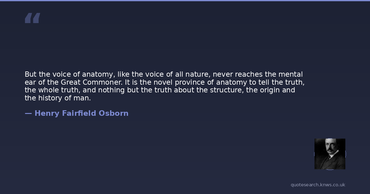 But the voice of anatomy, like the voice of all nature, never reaches the mental ear of the Great Commoner. It is the novel province of anatomy to tell the truth, the whole truth, and nothing but the truth about the structure, the origin and the history of man.