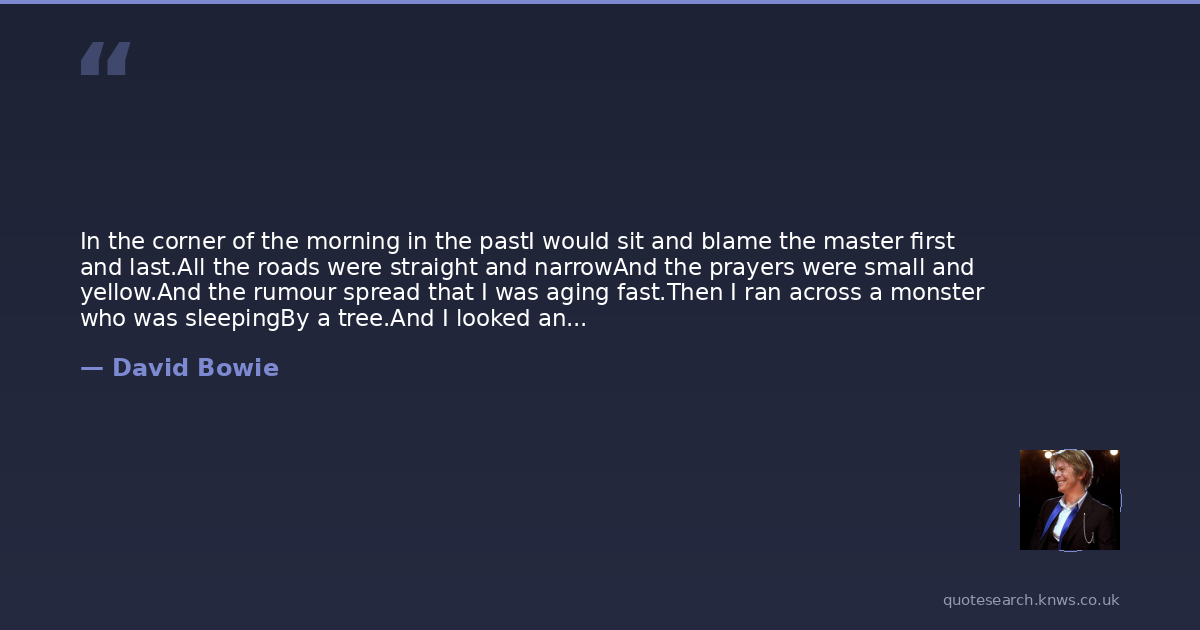 In the corner of the morning in the pastI would sit and blame the master first and last.All the roads were straight and narrowAnd the prayers were small and yellow.And the rumour spread that I was aging fast.Then I ran across a monster who was sleepingBy a tree.And I looked and frowned and the monster was me.