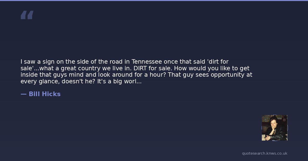 I saw a sign on the side of the road in Tennessee once that said 'dirt for sale'...what a great country we live in. DIRT for sale. How would you like to get inside that guys mind and look around for a hour? That guy sees opportunity at every glance, doesn't he? It's a big world for this gentleman. 'Oh my god, honey! Honey quit servin' waffles and come here baby. I'm gunna sell dirt! Look it's everywhere. You need it for our planet, honey!' The place was called Land Land.