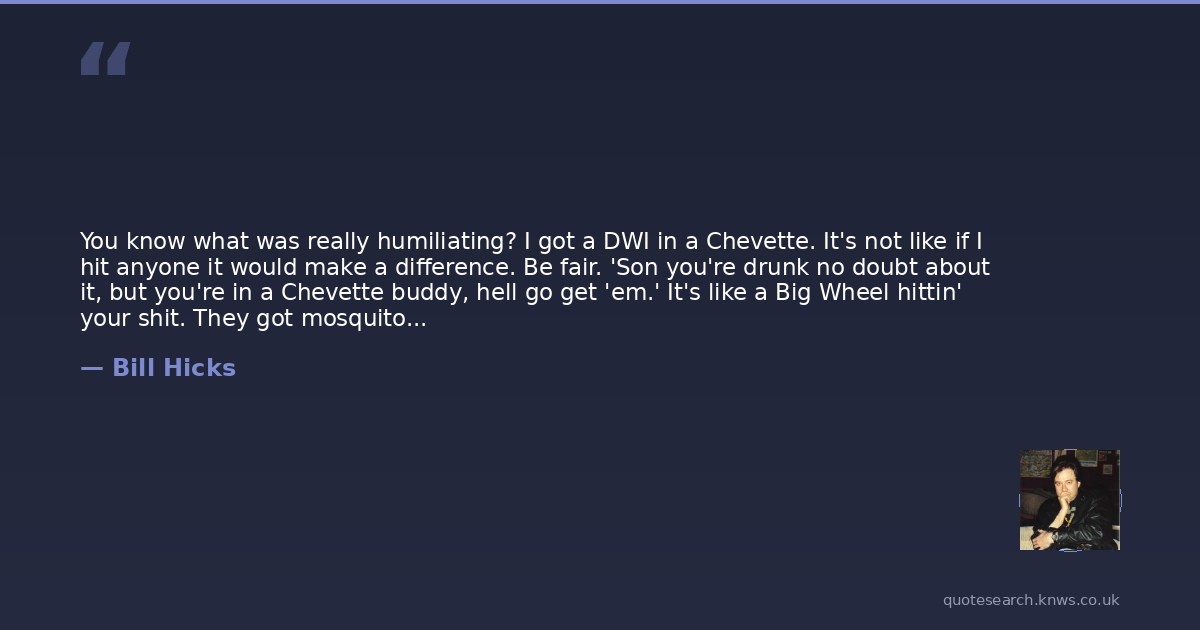 You know what was really humiliating? I got a DWI in a Chevette. It's not like if I hit anyone it would make a difference. Be fair. 'Son you're drunk no doubt about it, but you're in a Chevette buddy, hell go get 'em.' It's like a Big Wheel hittin' your shit. They got mosquitoes bigger than these fuckin' cars. Piece of shit car. Turn the air conditioner on in a Chevette while you're driving it's like hitting the car in the balls. It goes down to 5 all of a sudden. I feel like the Flintstones in that thing. You push the lighter in the battery light comes on. No wonder I'm fuckin' drunk. I hit a moth one time it did $400 damage to this piece of shit. The moth was all right he rolled with it. He took off I'm waitin' for a tow truck. 'What happened to your car buddy?' Shit I hit a bug. 'You're lucky to be alive. A man in Tennessee hit a ladybug in one of them things, sheared his head clean off...and his thumbs.'.
