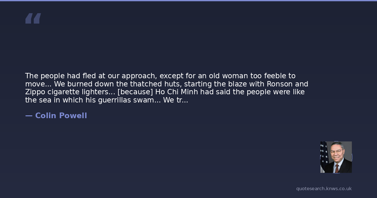 The people had fled at our approach, except for an old woman too feeble to move... We burned down the thatched huts, starting the blaze with Ronson and Zippo cigarette lighters... [because] Ho Chi Minh had said the people were like the sea in which his guerrillas swam... We tried to solve the problem by making the whole sea uninhabitable.
