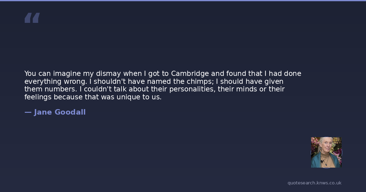 You can imagine my dismay when I got to Cambridge and found that I had done everything wrong. I shouldn't have named the chimps; I should have given them numbers. I couldn't talk about their personalities, their minds or their feelings because that was unique to us.