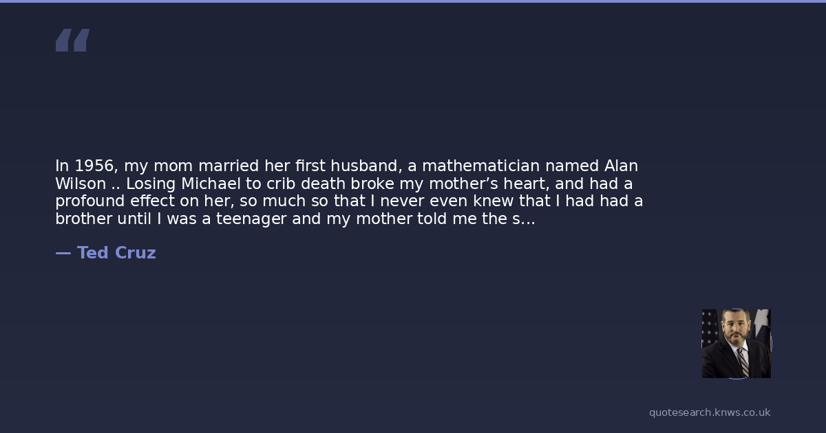 In 1956, my mom married her first husband, a mathematician named Alan Wilson .. Losing Michael to crib death broke my mother’s heart, and had a profound effect on her, so much so that I never even knew that I had had a brother until I was a teenager and my mother told me the story .. And the heartbreak also ended her marriage.
