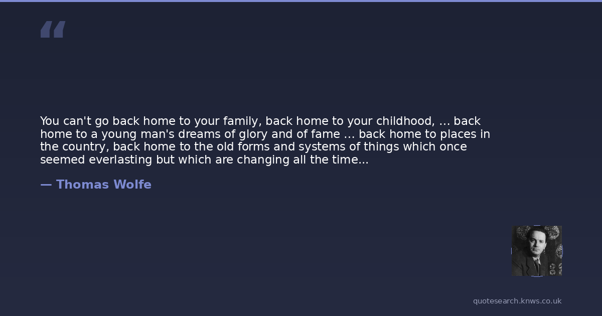 You can't go back home to your family, back home to your childhood, … back home to a young man's dreams of glory and of fame … back home to places in the country, back home to the old forms and systems of things which once seemed everlasting but which are changing all the time -- back home to the escapes of Time and Memory.