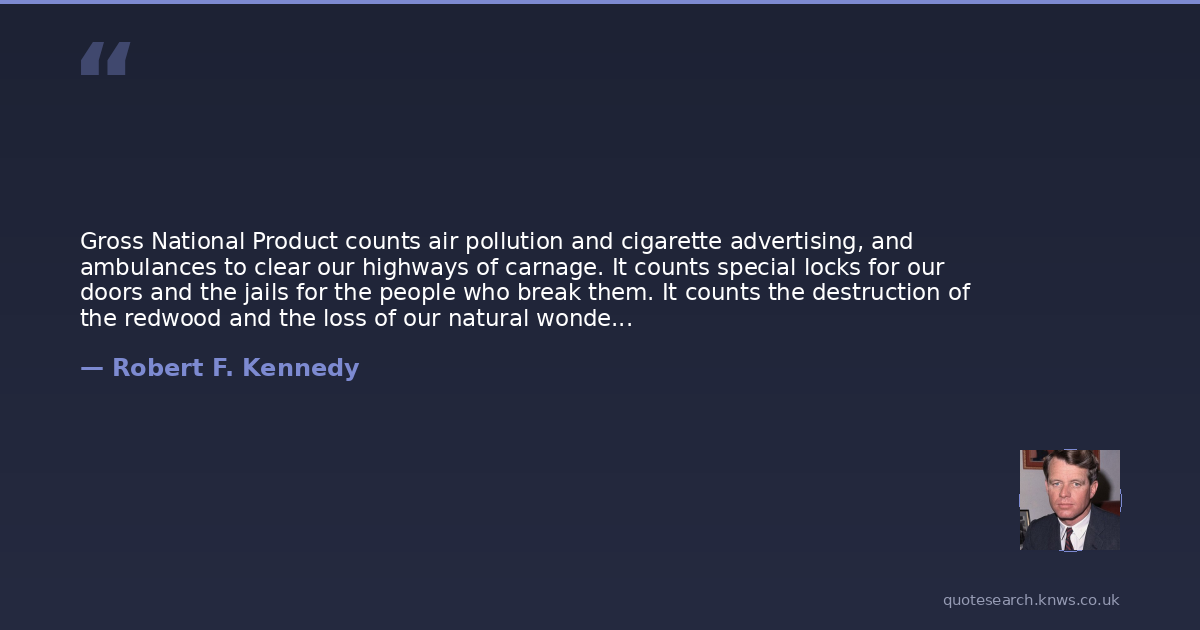 Gross National Product counts air pollution and cigarette advertising, and ambulances to clear our highways of carnage. It counts special locks for our doors and the jails for the people who break them. It counts the destruction of the redwood and the loss of our natural wonder in chaotic sprawl. It counts napalm and counts nuclear warheads and armored cars for the police to fight the riots in our cities. It counts Whitman's rifle and Speck's knife, and the television programs which glorify violence in order to sell toys to our children. Yet the gross national product does not allow for the health of our children, the quality of their education or the joy of their play. It does not include the beauty of our poetry or the strength of our marriages, the intelligence of our public debate or the integrity of our public officials. It measures neither our wit nor our courage, neither our wisdom nor our learning, neither our compassion nor our devotion to our country, it measures everything in short, except that which makes life worthwhile. And it can tell us everything about America except why we are proud that we are Americans.