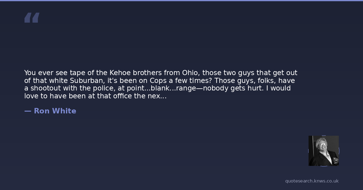 You ever see tape of the Kehoe brothers from Ohio, those two guys that get out of that white Suburban, it's been on Cops a few times? Those guys, folks, have a shootout with the police, at point...blank...range—nobody gets hurt. I would love to have been at that office the next day when that guy's being interviewed by the police. And then what happened? Well, at that point, I unloaded my semi-automatic 9 millimeter weapon at point blank range. And then what happened? They...left. Nice shooting, Elmer Fudd. There was a kid in Detroit a few years ago, shot 8 bullets, hit 9 people. These cops fired 22 shots, didn't even hit the fuckin' Suburban!