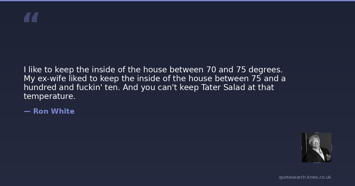 I like to keep the inside of the house between 70 and 75 degrees. My ex-wife liked to keep the inside of the house between 75 and a hundred and fuckin' ten. And you can't keep Tater Salad at that temperature.