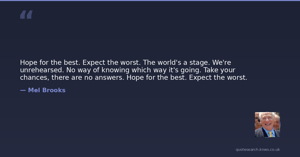 Hope for the best. Expect the worst. The world's a stage. We're unrehearsed. No way of knowing which way it's going. Take your chances, there are no answers. Hope for the best. Expect the worst.
