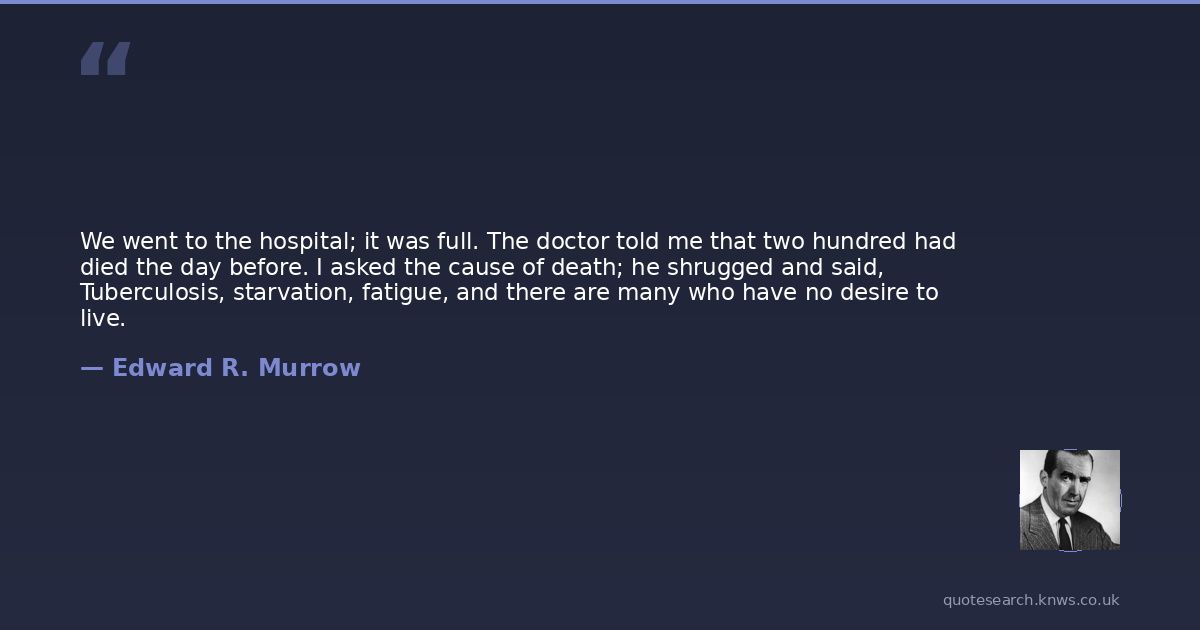 We went to the hospital; it was full. The doctor told me that two hundred had died the day before. I asked the cause of death; he shrugged and said, Tuberculosis, starvation, fatigue, and there are many who have no desire to live.