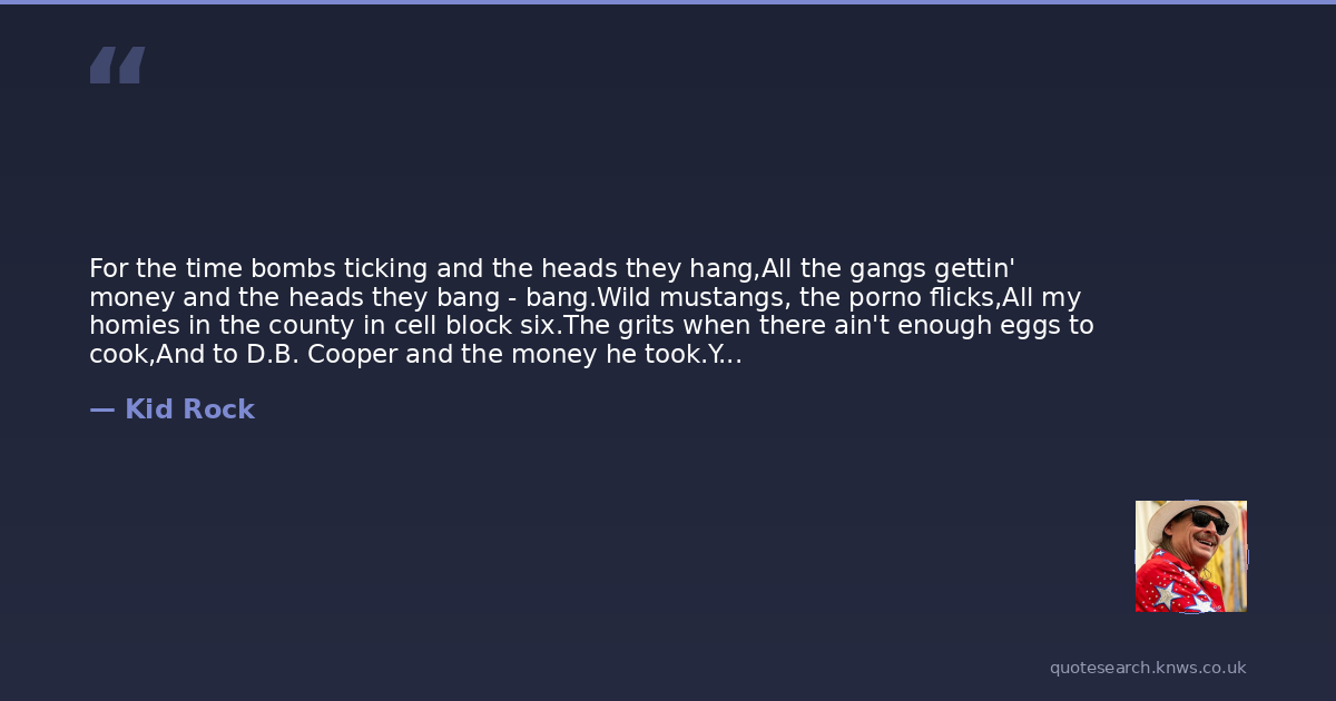For the time bombs ticking and the heads they hang,All the gangs gettin' money and the heads they bang - bang.Wild mustangs, the porno flicks,All my homies in the county in cell block six.The grits when there ain't enough eggs to cook,And to D.B. Cooper and the money he took.You can look for answers but that ain't fun,Now get in the pit and try to love someone.
