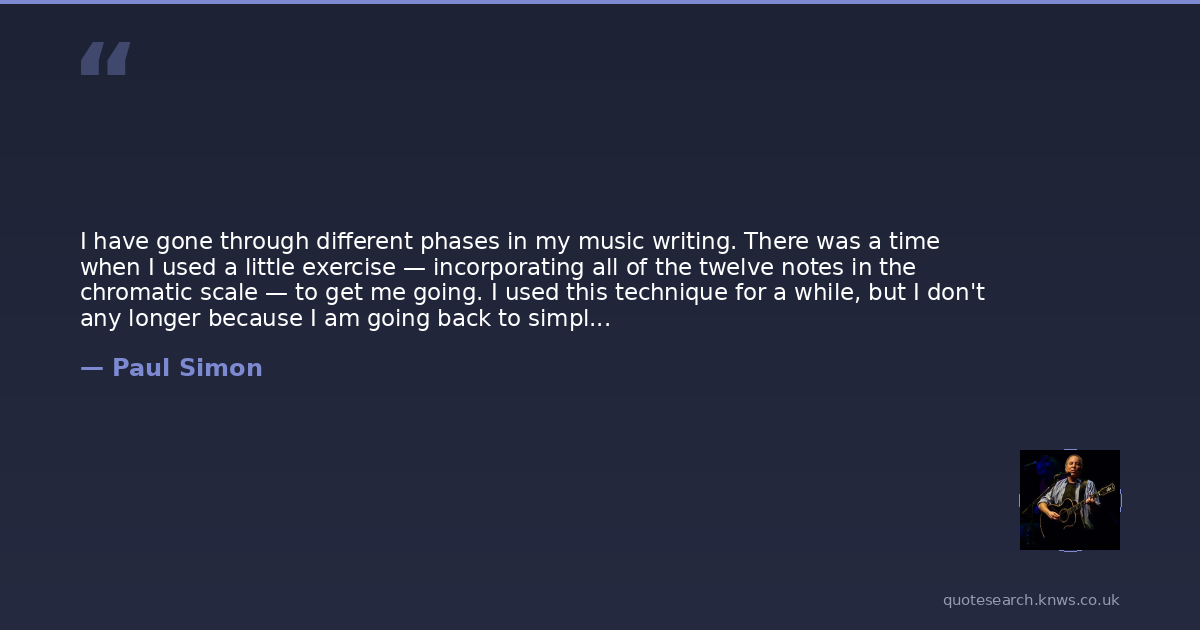 I have gone through different phases in my music writing. There was a time when I used a little exercise — incorporating all of the twelve notes in the chromatic scale — to get me going. I used this technique for a while, but I don't any longer because I am going back to simpler melodies. Originally I moved away from the simple songs because I thought they were too simple.