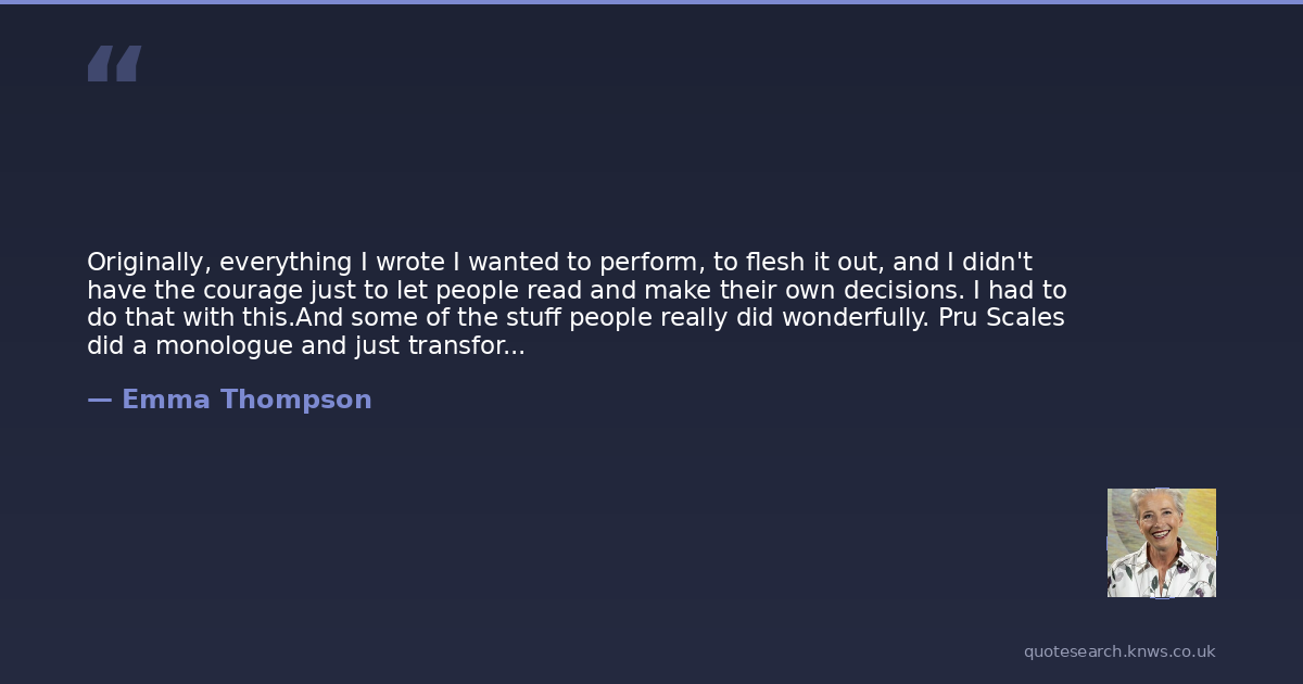 Originally, everything I wrote I wanted to perform, to flesh it out, and I didn't have the courage just to let people read and make their own decisions. I had to do that with this.And some of the stuff people really did wonderfully. Pru Scales did a monologue and just transformed it in my eyes — I thought it was rather ordinary and she made it into something really terrific.
