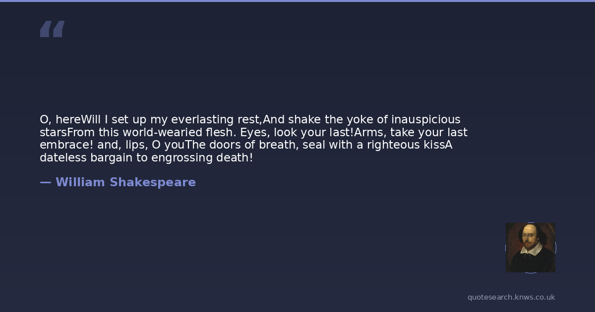 O, hereWill I set up my everlasting rest,And shake the yoke of inauspicious starsFrom this world-wearied flesh. Eyes, look your last!Arms, take your last embrace! and, lips, O youThe doors of breath, seal with a righteous kissA dateless bargain to engrossing death!