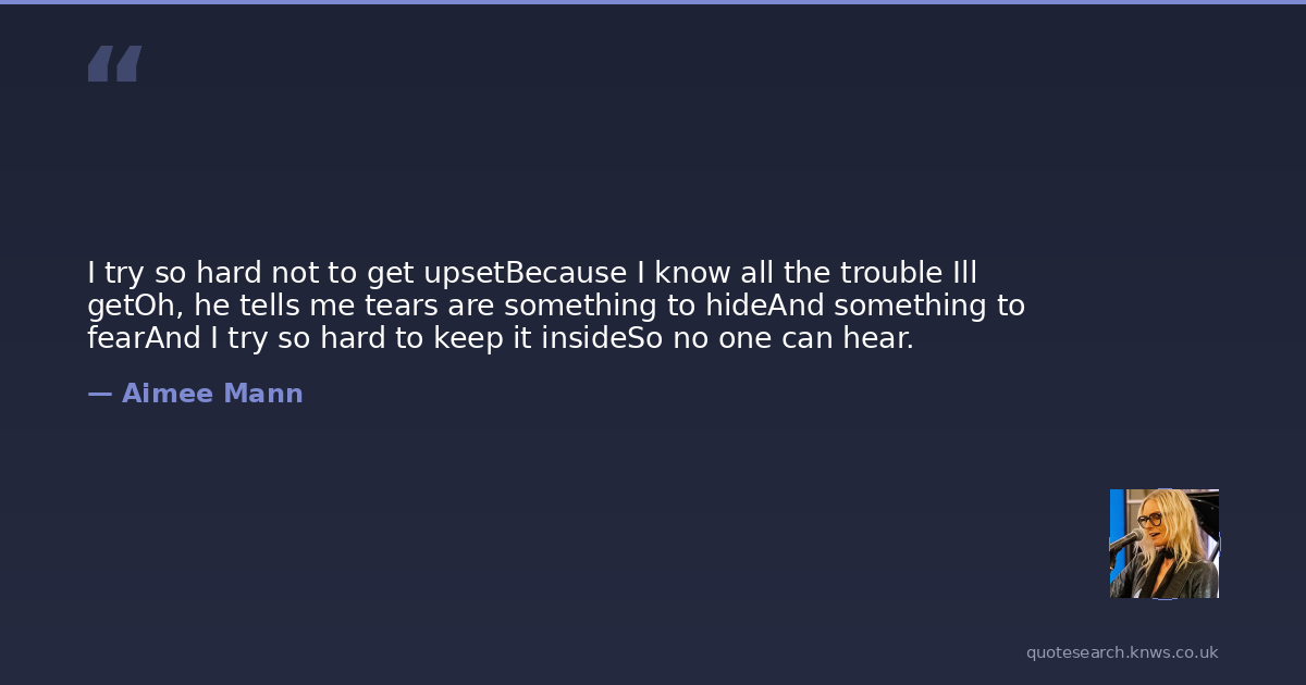 I try so hard not to get upsetBecause I know all the trouble Ill getOh, he tells me tears are something to hideAnd something to fearAnd I try so hard to keep it insideSo no one can hear.