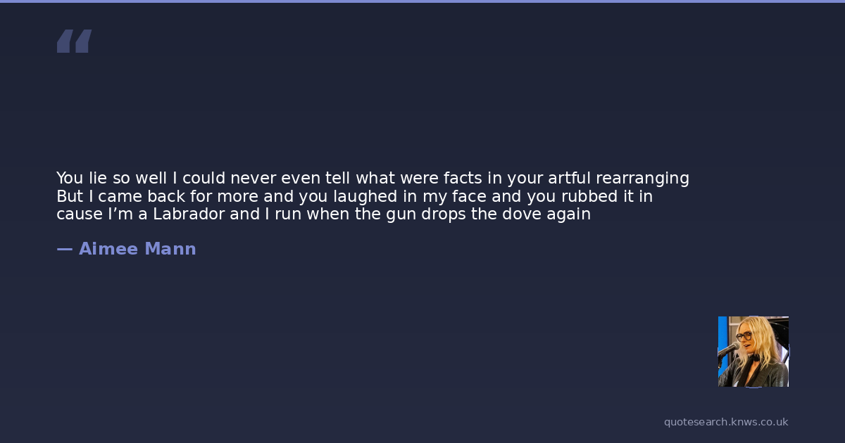 You lie so well I could never even tell what were facts in your artful rearranging But I came back for more and you laughed in my face and you rubbed it in cause I’m a Labrador and I run when the gun drops the dove again