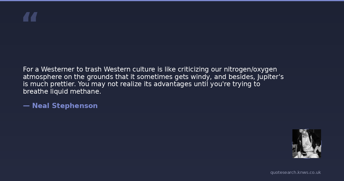 For a Westerner to trash Western culture is like criticizing our nitrogen/oxygen atmosphere on the grounds that it sometimes gets windy, and besides, Jupiter's is much prettier. You may not realize its advantages until you're trying to breathe liquid methane.