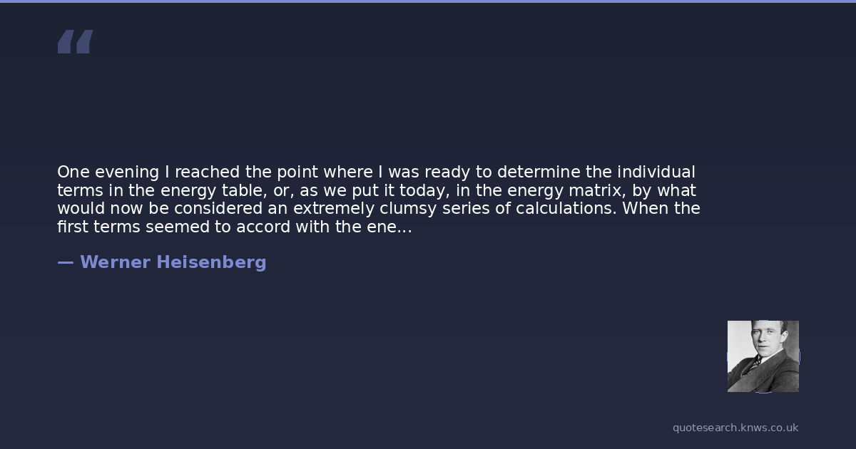 One evening I reached the point where I was ready to determine the individual terms in the energy table, or, as we put it today, in the energy matrix, by what would now be considered an extremely clumsy series of calculations. When the first terms seemed to accord with the energy principle, I became rather excited, and I began to make countless arithmetical errors. As a result, it was almost three o'clock in the morning before the final result of my computations lay before me. The energy principle had held for all terms, and I could no longer doubt the mathematical consistency and coherence of the kind of quantum mechanics to which my calculations pointed. At first, I was deeply alarmed. I had the feeling that, through the surface of atomic phenomena, I was looking at a strangely beautiful interior, and I felt almost giddy at the thought that I now had to probe this wealth of mathematical structures nature had so generously spread out before me. I was far too excited to sleep, and so, as a new day dawned, I made for the southern tip of the island, where I had been longing to climb a rock jutting out into the sea. I now did so without too much trouble, and waited for the sun to rise.