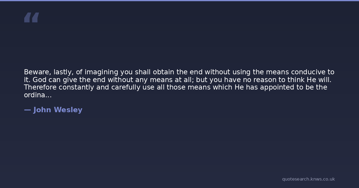 Beware, lastly, of imagining you shall obtain the end without using the means conducive to it. God can give the end without any means at all; but you have no reason to think He will. Therefore constantly and carefully use all those means which He has appointed to be the ordinary channels of His grace. Use every means which either reason or Scripture recommends, as conducive (through the free love of God in Christ) either to the obtaining or increasing any of the gifts of God. Thus expect a daily growth in that pure and holy religion which the world always did, and always will, call enthusiasm; but which, to all who are saved from real enthusiasm, from merely nominal Christianity, is the wisdom of God, and the power of God; the glorious image of the Most High; righteousness and peace; a fountain of living water, springing up into everlasting life!