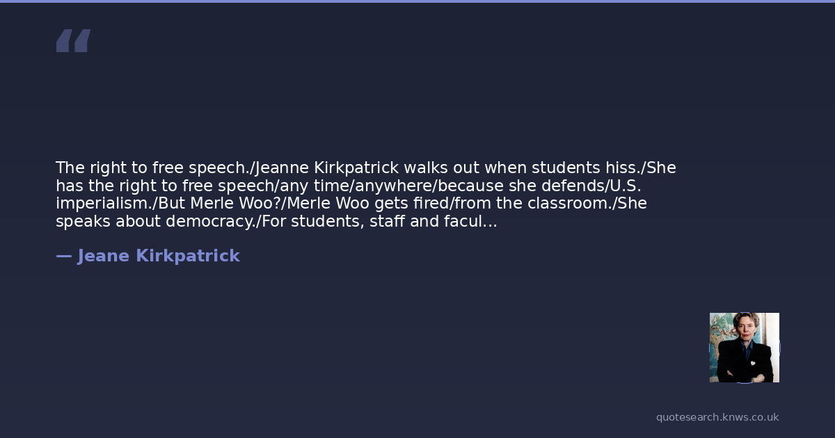 The right to free speech./Jeanne Kirkpatrick walks out when students hiss./She has the right to free speech/any time/anywhere/because she defends/U.S. imperialism./But Merle Woo?/Merle Woo gets fired/from the classroom./She speaks about democracy./For students, staff and faculty. Against censorship./For a Third World College. Against cultural genocide./For lesbians and gays. Against heterosexism./For the possibility of all our voices,/in all languages, singing out.