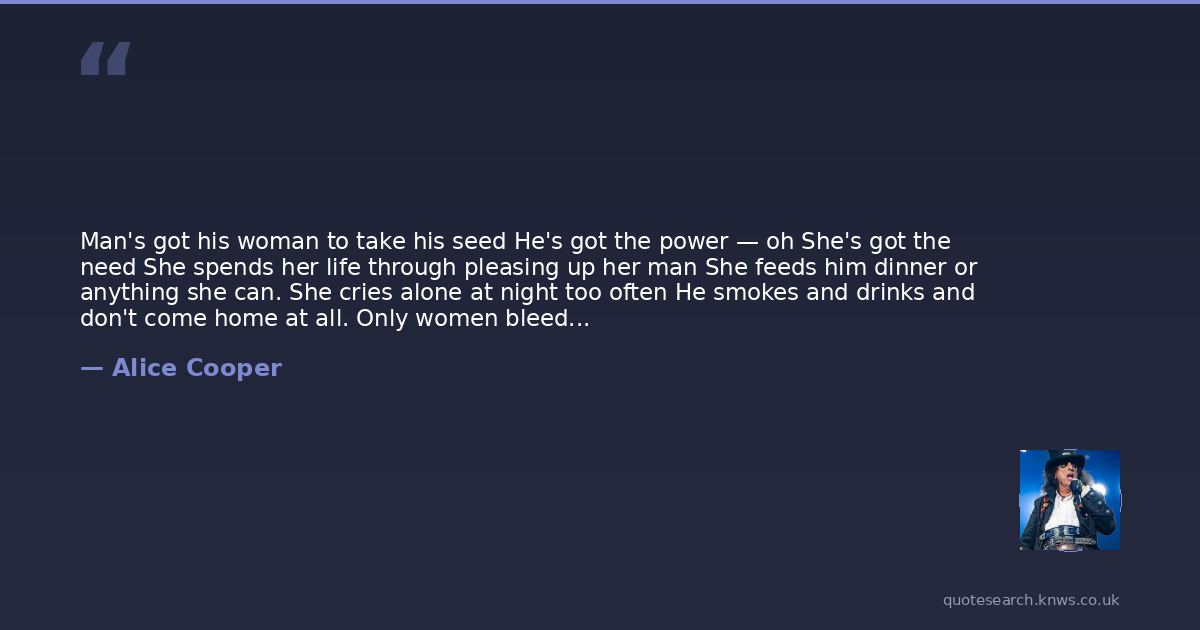 Man's got his woman to take his seed He's got the power — oh She's got the need She spends her life through pleasing up her man She feeds him dinner or anything she can. She cries alone at night too often He smokes and drinks and don't come home at all. Only women bleed...