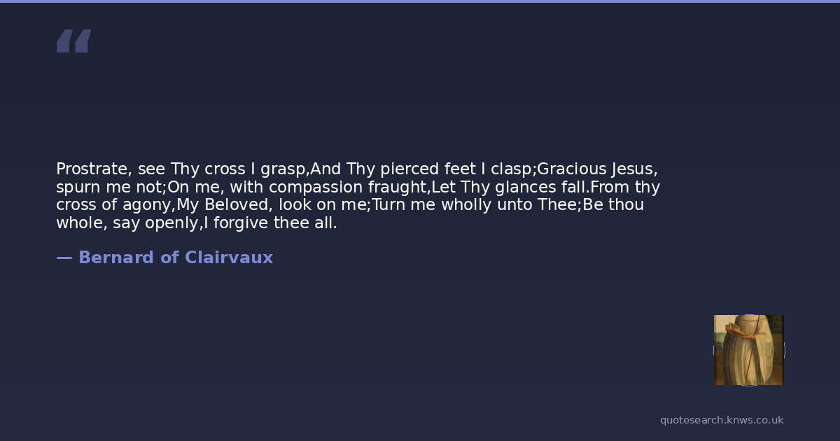 Prostrate, see Thy cross I grasp,And Thy pierced feet I clasp;Gracious Jesus, spurn me not;On me, with compassion fraught,Let Thy glances fall.From thy cross of agony,My Beloved, look on me;Turn me wholly unto Thee;Be thou whole, say openly,I forgive thee all.