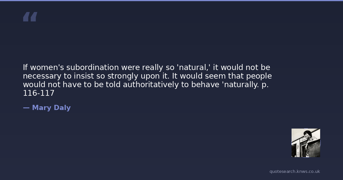 If women's subordination were really so 'natural,' it would not be necessary to insist so strongly upon it. It would seem that people would not have to be told authoritatively to behave 'naturally. p. 116-117