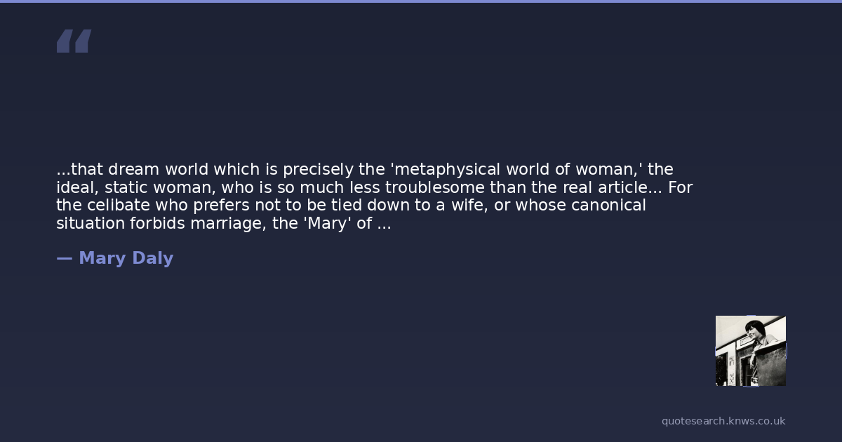 ...that dream world which is precisely the 'metaphysical world of woman,' the ideal, static woman, who is so much less troublesome than the real article... For the celibate who prefers not to be tied down to a wife, or whose canonical situation forbids marriage, the 'Mary' of his imagination could appear to be the ideal spouse. p. 161