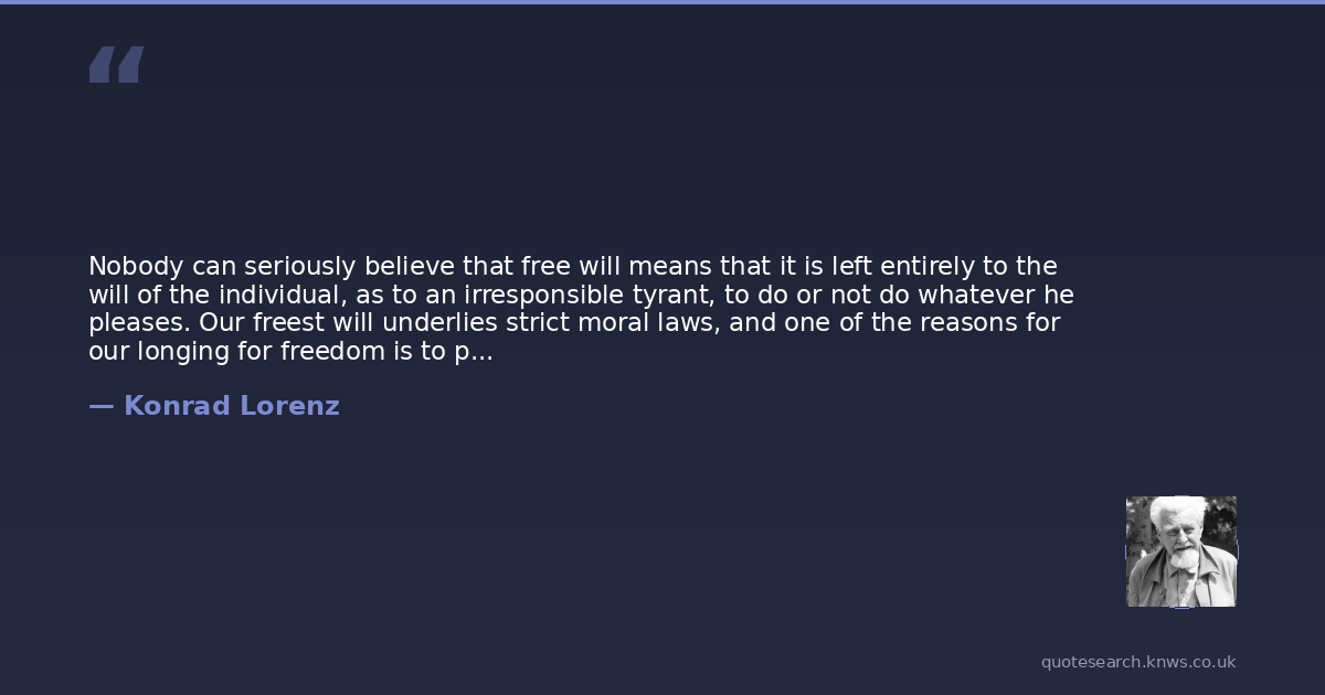 Nobody can seriously believe that free will means that it is left entirely to the will of the individual, as to an irresponsible tyrant, to do or not do whatever he pleases. Our freest will underlies strict moral laws, and one of the reasons for our longing for freedom is to prevent our obeying other laws than these. It is significant that the anguished feeling of not being free is never evoked by the realisation that our behaviour is just as firmly bound to moral laws as physiological processes are to physical ones. We are all agreed that the greatest and most precious freedom of man is identical with the moral laws within him. Increasing knowledge of the natural causes of his own behaviour can certainly increase a man's faculties and enable him to put his free will into action, but it can never diminish his will. If, in the impossible case of an utopian complete and ultimate success of causal analysis, man should ever achieve complete insight into the causality of earthly phenomena, including the workings of his own organism, he would not cease to have a will but it would be in perfect harmony with the incontrovertible lawfulness of the universe, the Weltvernunft of the Logos. This idea is foreign only to our present-day western thought; it was quite familiar to ancient Indian philosophy and to the mystics of the middle ages.