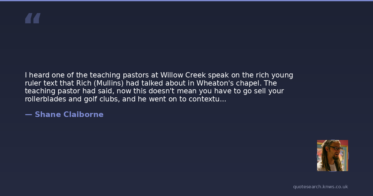 I heard one of the teaching pastors at Willow Creek speak on the rich young ruler text that Rich (Mullins) had talked about in Wheaton's chapel. The teaching pastor had said, now this doesn't mean you have to go sell your rollerblades and golf clubs, and he went on to contextualize the teaching to show that we just need to be careful not to make idols of our things. I wasn't so sure about that. Jesus doesn't tell the man to be a better steward, or to treat his workers fairly, or not to make money an idol. He tells this highly educated and devoutly religious young man that he lacks one thing: giving up everything he owns to give the poor. (p. 103)
