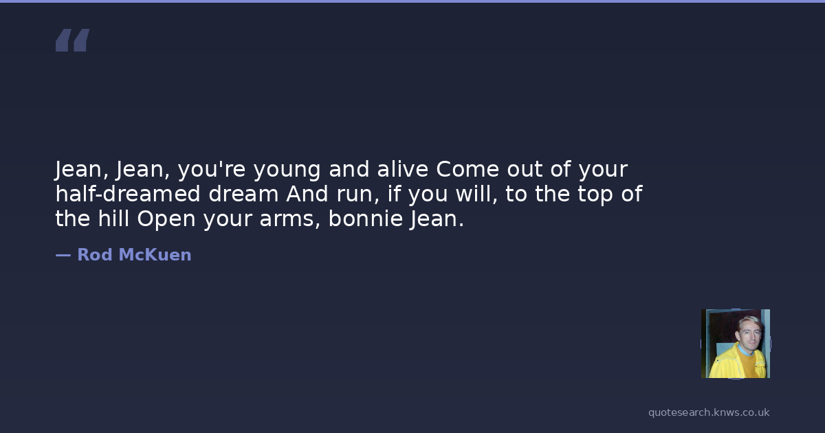 Jean, Jean, you're young and alive Come out of your half-dreamed dream And run, if you will, to the top of the hill Open your arms, bonnie Jean.