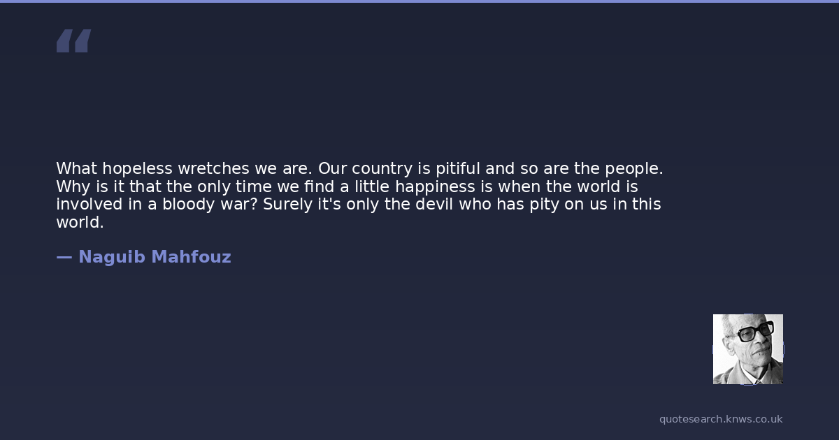 What hopeless wretches we are. Our country is pitiful and so are the people. Why is it that the only time we find a little happiness is when the world is involved in a bloody war? Surely it's only the devil who has pity on us in this world.