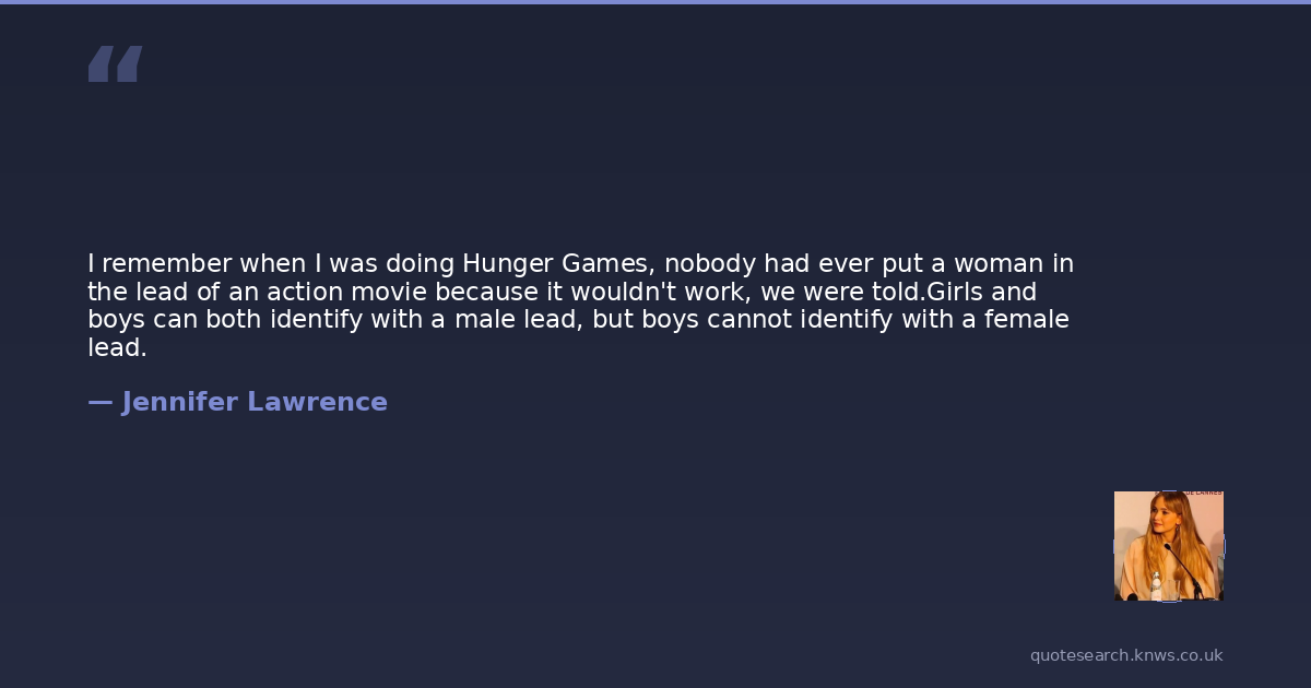 I remember when I was doing Hunger Games, nobody had ever put a woman in the lead of an action movie because it wouldn't work, we were told.Girls and boys can both identify with a male lead, but boys cannot identify with a female lead.
