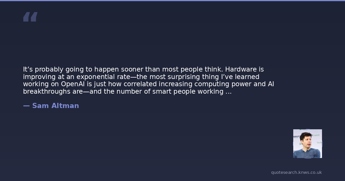 It’s probably going to happen sooner than most people think. Hardware is improving at an exponential rate—the most surprising thing I’ve learned working on OpenAI is just how correlated increasing computing power and AI breakthroughs are—and the number of smart people working on AI is increasing exponentially as well. Double exponential functions get away from you fast.