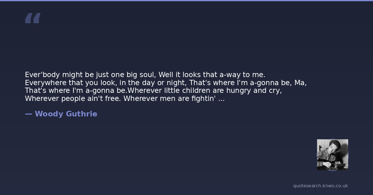 Ever'body might be just one big soul, Well it looks that a-way to me. Everywhere that you look, in the day or night, That's where I'm a-gonna be, Ma, That's where I'm a-gonna be.Wherever little children are hungry and cry, Wherever people ain't free. Wherever men are fightin' for their rights, That's where I'm a-gonna be, Ma. That's where I'm a-gonna be.