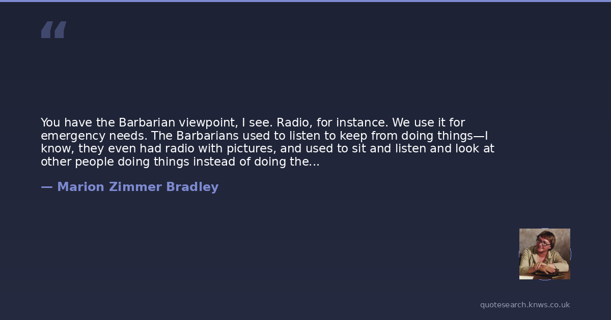 You have the Barbarian viewpoint, I see. Radio, for instance. We use it for emergency needs. The Barbarians used to listen to keep from doing thingsāI know, they even had radio with pictures, and used to sit and listen and look at other people doing things instead of doing them themselves.
