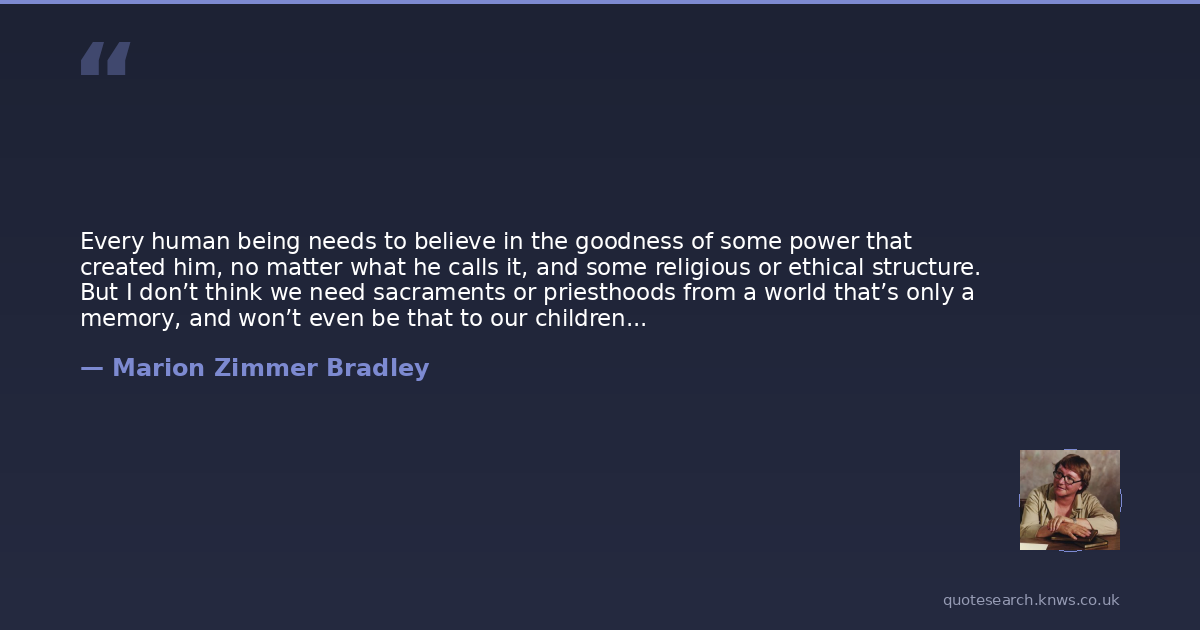 Every human being needs to believe in the goodness of some power that created him, no matter what he calls it, and some religious or ethical structure. But I don’t think we need sacraments or priesthoods from a world that’s only a memory, and won’t even be that to our children and our children’s children. Ethics, yes. Art, yes. Music, crafts, knowledge, humanity—yes. But not rituals which will quickly dwindle down into superstitions. And certainly not a social code or a set of purely arbitrary behavioral attitudes which have nothing to do with the society we are in now.